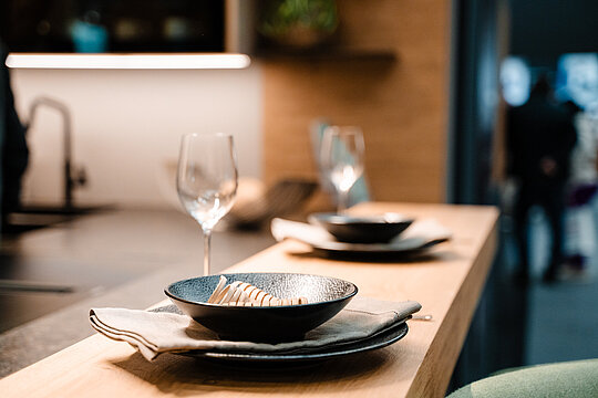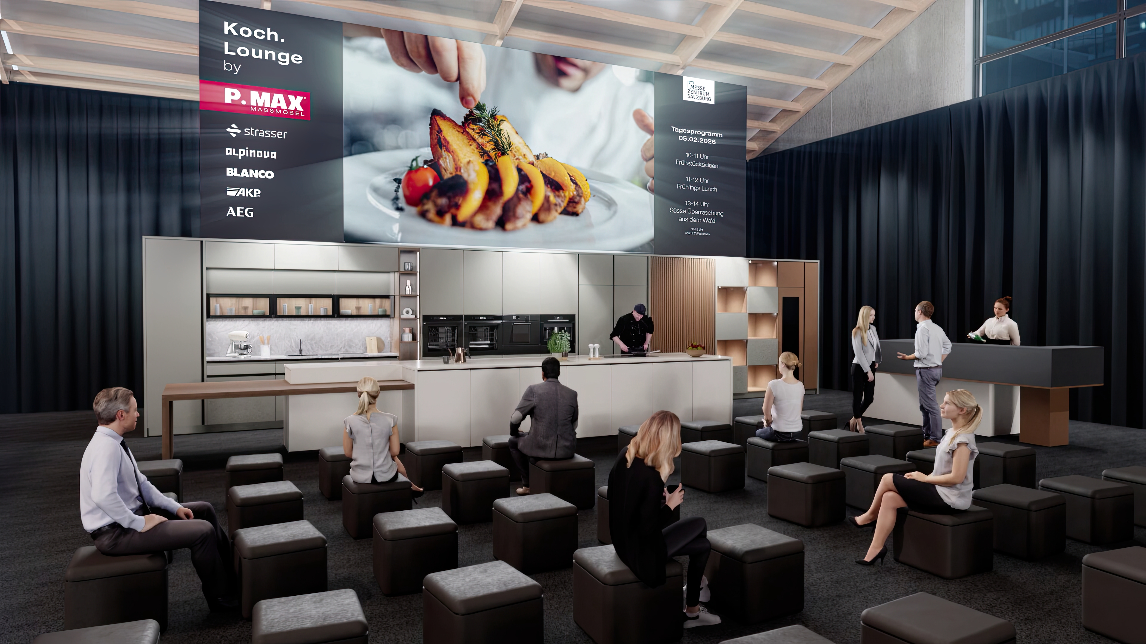 Die KochLounge by P.MAX bringt Live-Kulinarik direkt auf die Messe. Herzstück der neuen Messebühne ist ein über 10 Meter langer Hochschrankblock, der mit seiner beeindruckenden Dimension und seinem integrierten Durchgang in die „Schattenküche“ sofort ins Auge fällt. Zusätzlich sorgt ein schachbrettartig gestaltetes Frontdesign für visuelle Spannung und dient gleichzeitig als stilvolle Präsentationsfläche für edle Tropfen, die in der angrenzenden Bar verkostet werden.